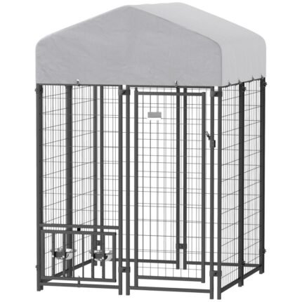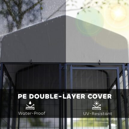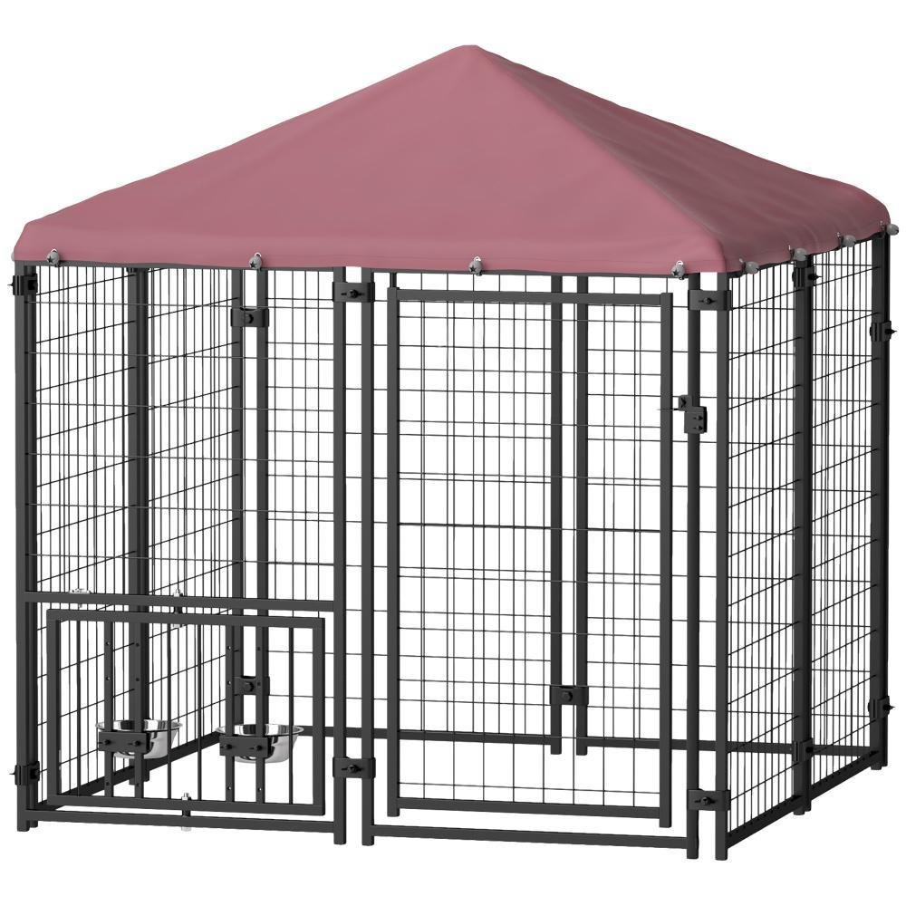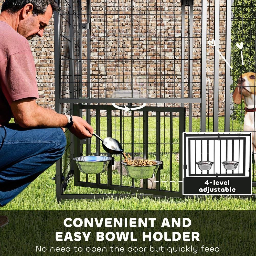 Welded Wire Outdoor Dog Kennel With 360 Rotating & 4 Levels Adjustable Bowls, Waterproof Cover, 4.6 X 4.6 X 5