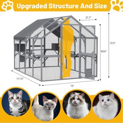 Large Wooden Outdoor, Cat Enclosure W 4 Tier Resting Rooms, 3 Platforms, 1 Soft Ladder, 2 Ramps, 1 Hammock, Gray